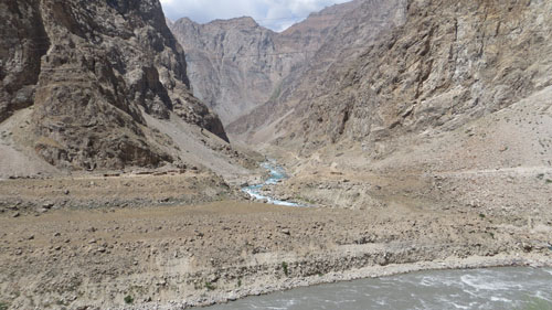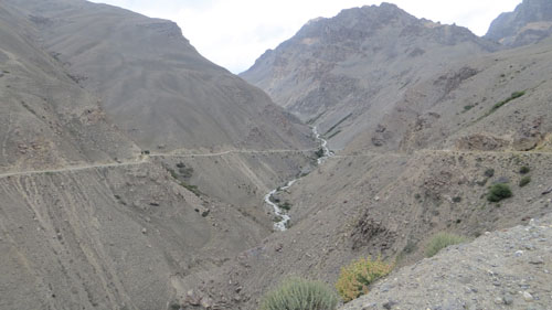 Ritorniamo quindi sulla M41 per percorrere pochi chilometri dato che la variazione che Giampiero ha introdotto al già collaudato giro del Tajikistan prevede di scendere verso la valle di Wakan. Se le condizioni stradali della M41 erano un po’ approssimative, quelle del percorso che abbiamo intrapreso non lasciano dubbi: in alcuni tratti la strada è poco più che una mulattiera, corre alta sul fiume sottostante, il Pamir, e sembra incisa con un coltello nelle pareti scoscese e brulle, segnate ogni tanto da argentei rigagnoli d’acqua. Ammaliante e splendida finché l’orizzonte si apre e compare la valle di Wakan con le montagne afghane che racchiudono il famoso Corridoio. Proprio nel punto dove il Pamir si getta nel Panji, il fiume che attraversa il Corridoio, c’è Langar, il villaggio dove passeremo la notte in un’ottima sistemazione.